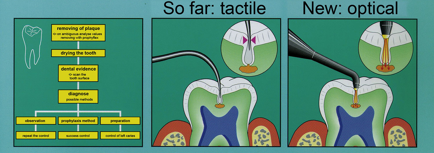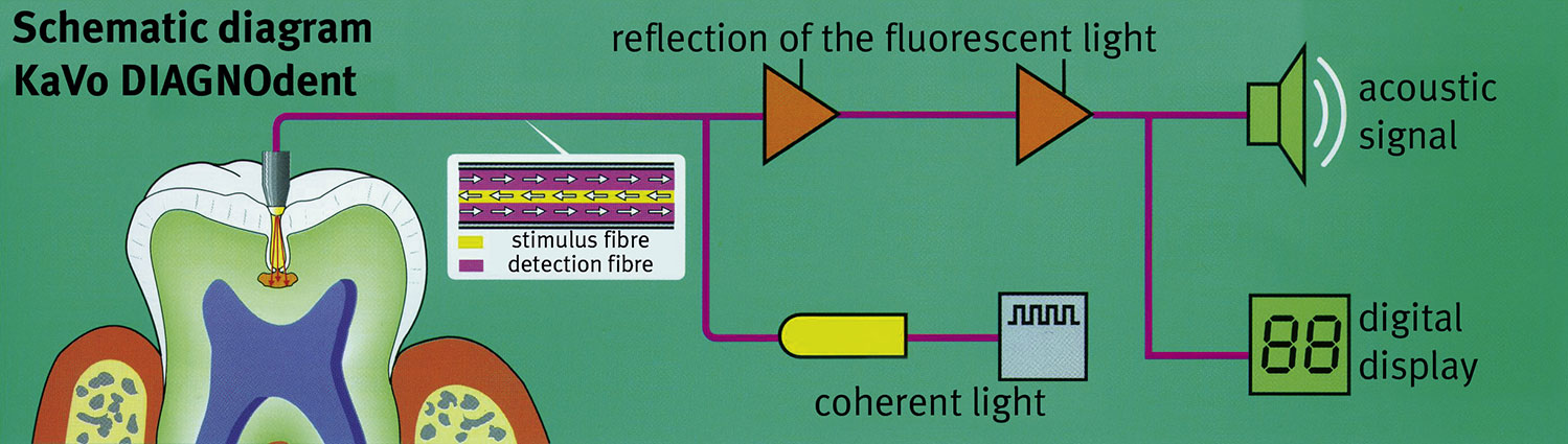 Modified tooth substance and bacteria fluoresce when they are stimulated by light of a particular wavelength. At a radiation wavelength of 550 - 670nm there is a clearly determinable fluorescence between 650 and 800nm. Radiation is done with a laser diode whose light is directed via a light conductor and a probe to the caries center. Modified tooth substance is stimulated by fluorescence.